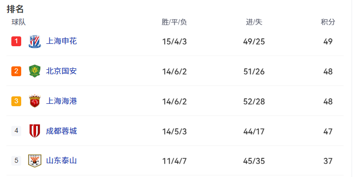 目前,中超积分榜前四名的球队中,分差只有2分!这也意味着,蓉城队、海港队以及国安队,3队将与申花队争抢第一名的位置。他们此番面对武汉三镇的比赛,压力同样不小。